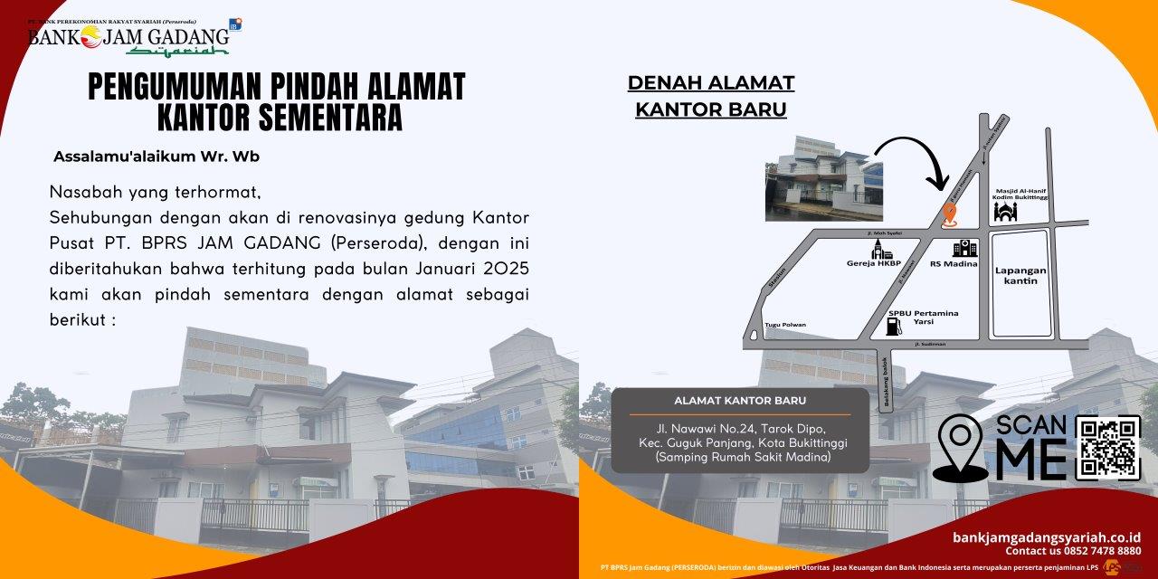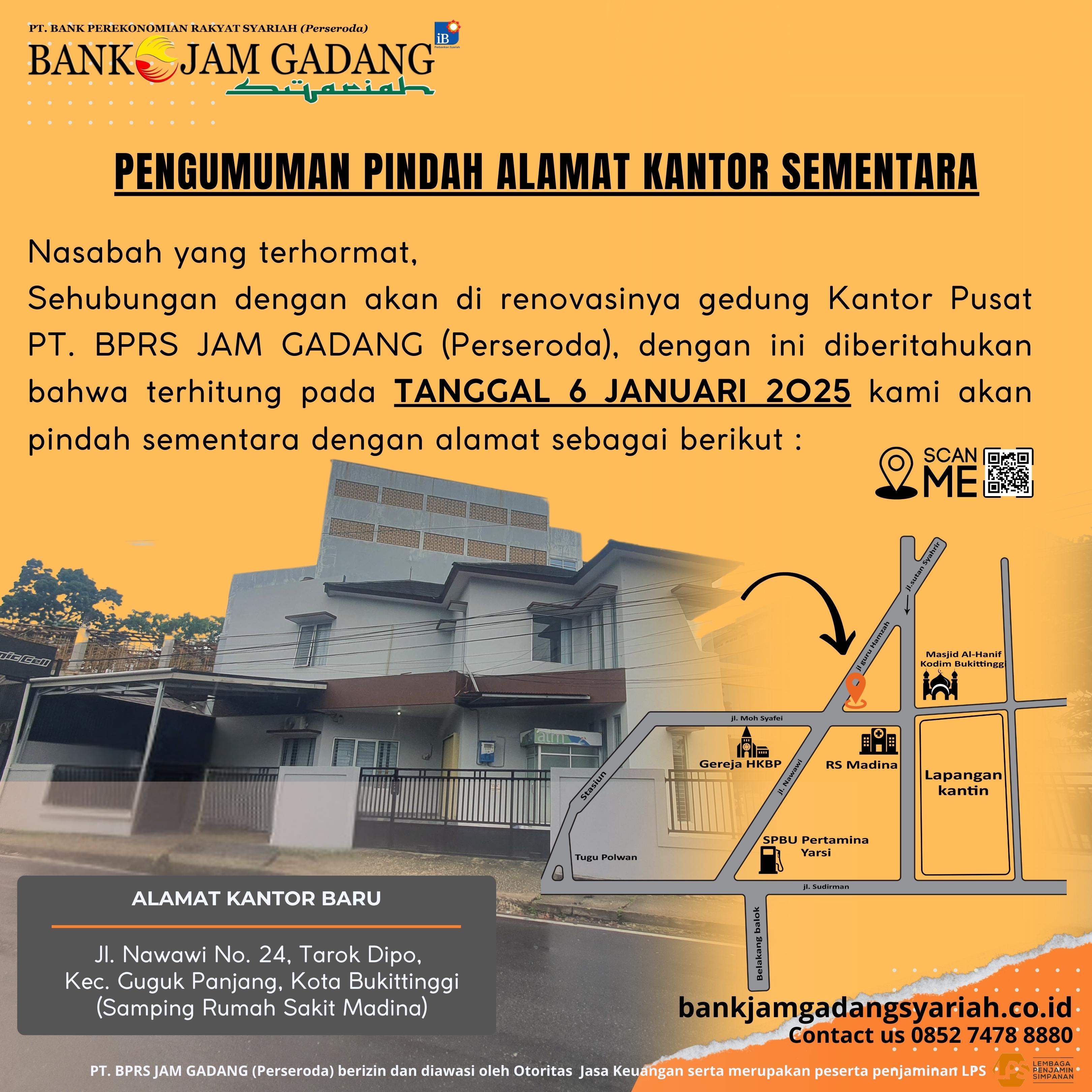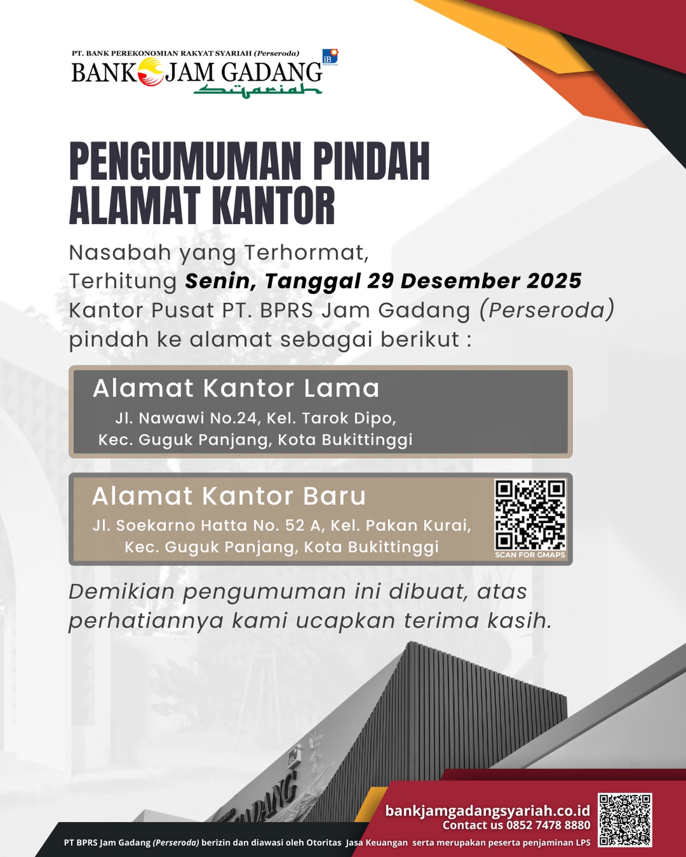 Pengumuman Pindah Alamat Kantor Pusat PT. BPRS Jam Gadang (Perseroda)