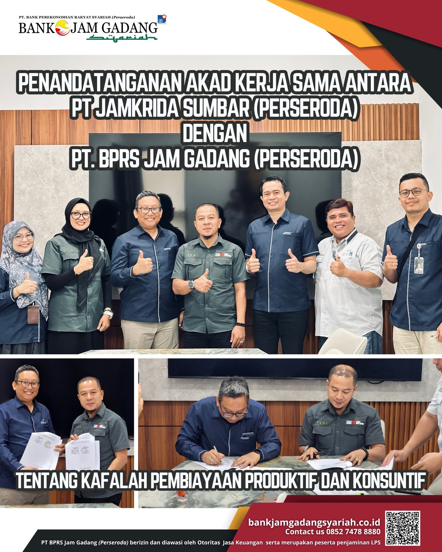 PENANDATANGANAN AKAD KERJA SAMA PT JAMKRIDA SUMBAR (PERSERODA) DENGAN PT. BPRS JAM GADANG (PERSERODA) Tentang Kafalah Pembiayaan Produktif…