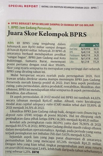 Bukittinggi, Sumatera Barat - PT BPRS Jam Gadang (Perseroda) meraih pencapaian luar biasa sebagai juara dalam kategori skor…