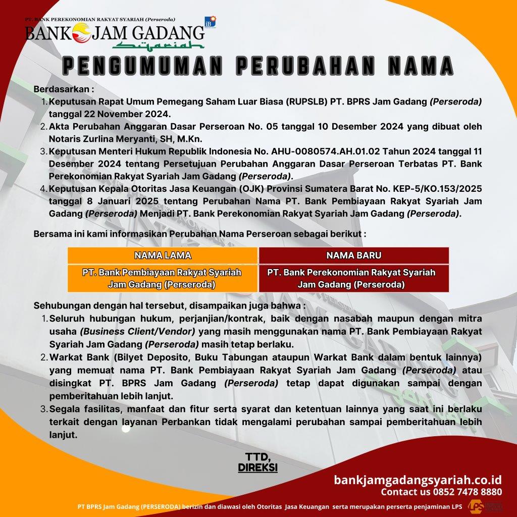 Dengan hormat kami sampaikan kepada seluruh nasabah dan mitra bahwa PT. BPRS Jam Gadang (Perseroda) akan melakukan perpindahan…