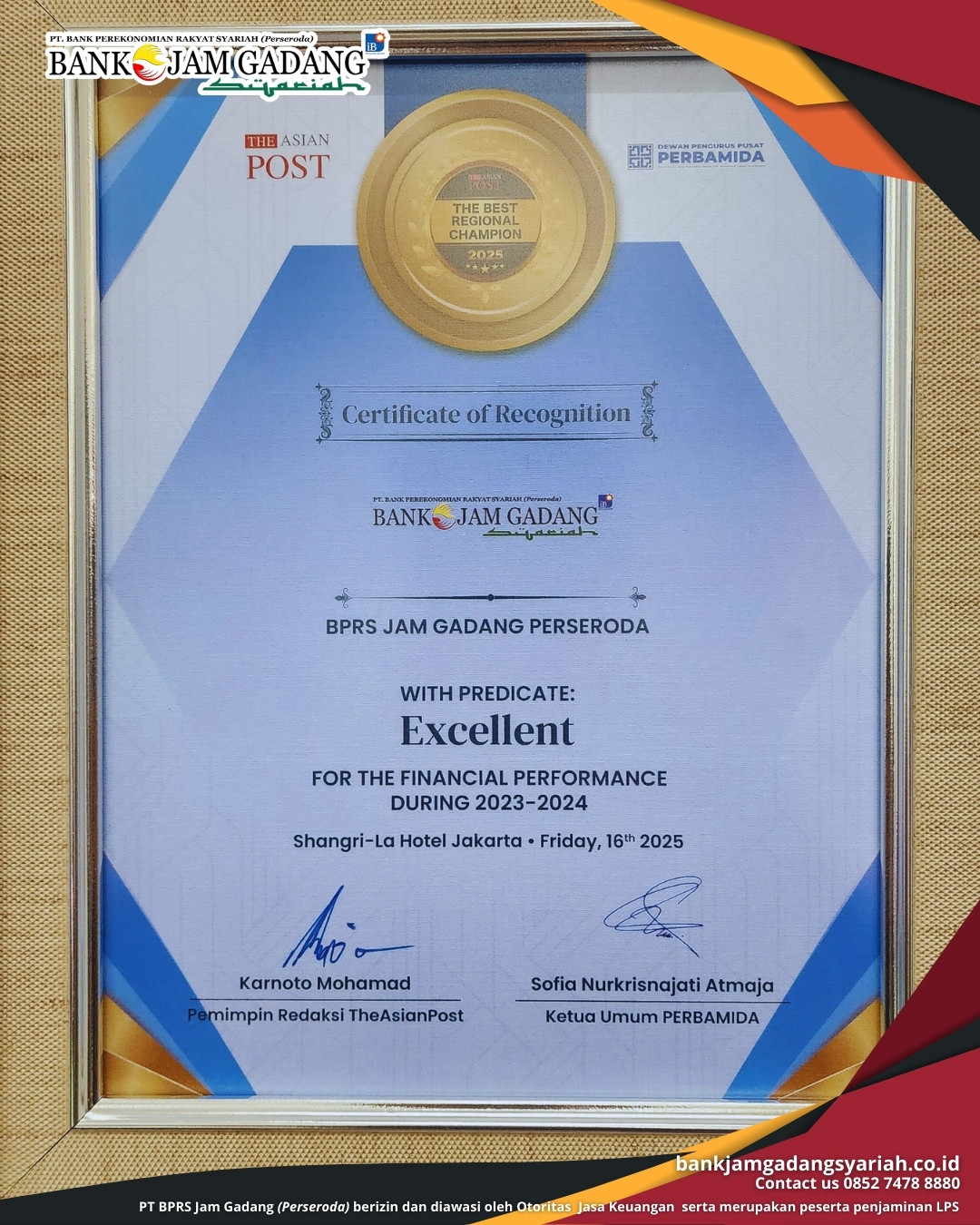 Alhamdulillah PT. BPRS Jam Gadang (Perseroda) telah dianugerahi penghargaan: ✨ THE BEST REGIONAL CHAMPION 2025 ✨ Dengan Predikat…